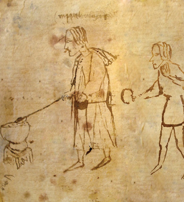 One of the oldest records that links the communal meal with a town celebration dates from between 1348 and 1403, from a drawing in a manual by notary Miquel Corsaví, of Castelló d’Empúries, owner of Verges’ Notary. In the drawing, there is a character that is serving food from a pot to another character who receives it.
