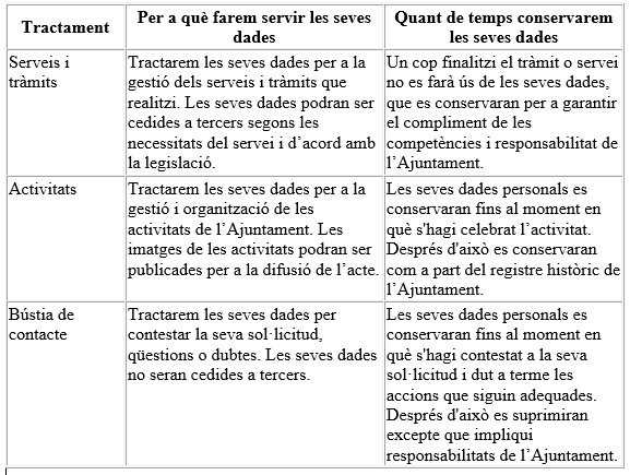 L’Ajuntament tracta les dades per a exercir les seves competències i funcions. Els serveis de l’Ajuntament es descriuen a la seva web i a la seva seu electrònica. Una descripció completa dels tractaments i de les finalitats a les que es destinen les dades figura al Registre de les Activitats de Tractament consultable en aquest enllaç [enllaç al Registre publicat a la seu electrònica].