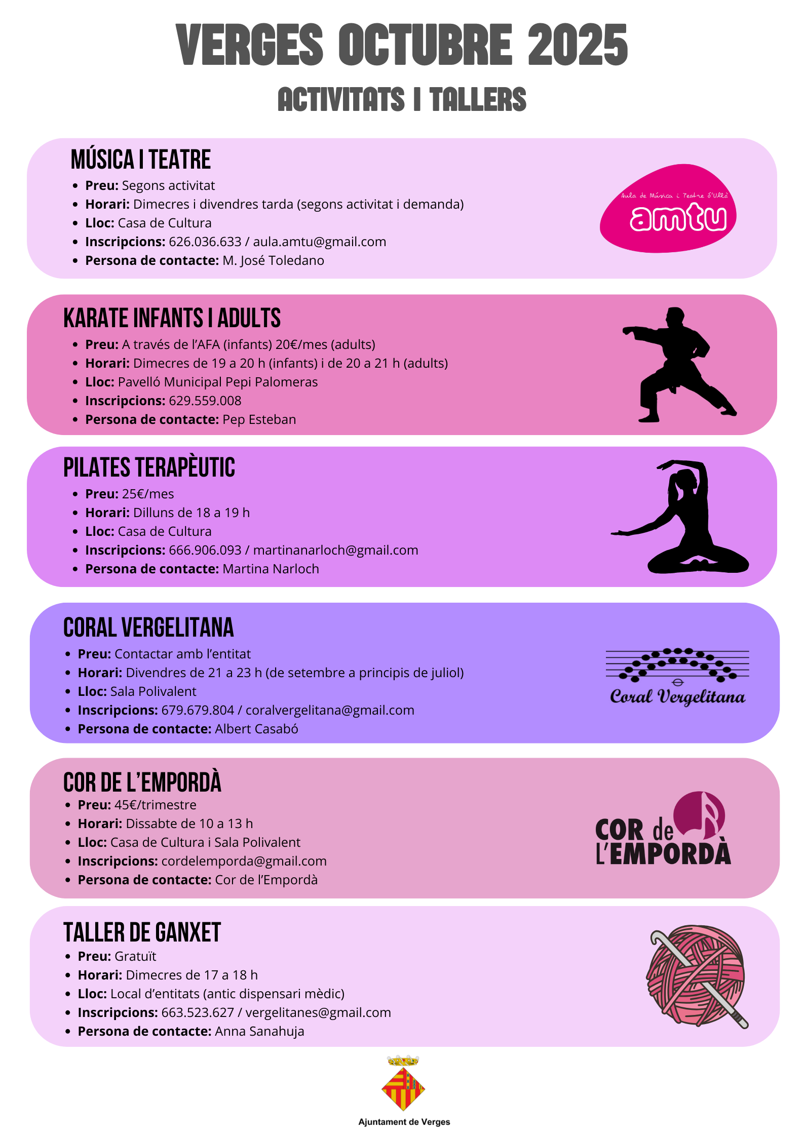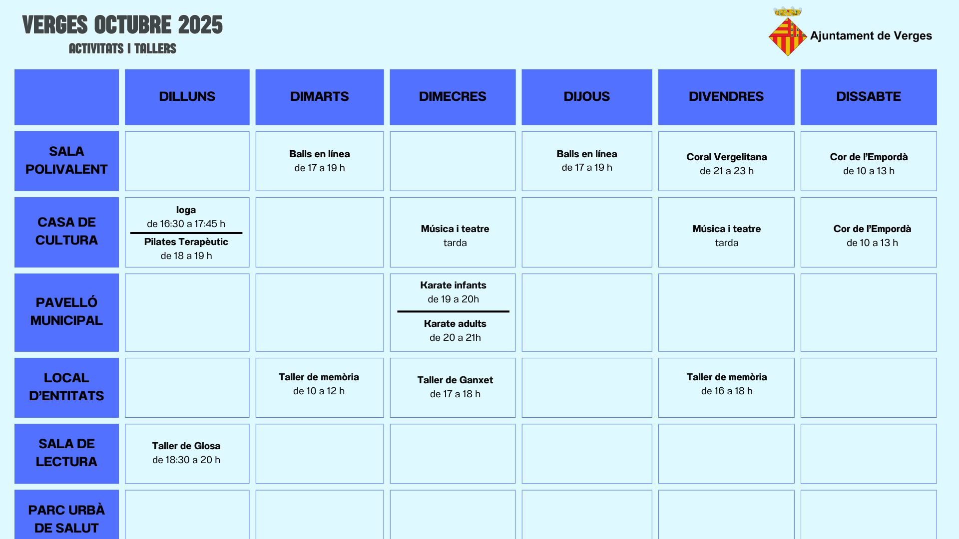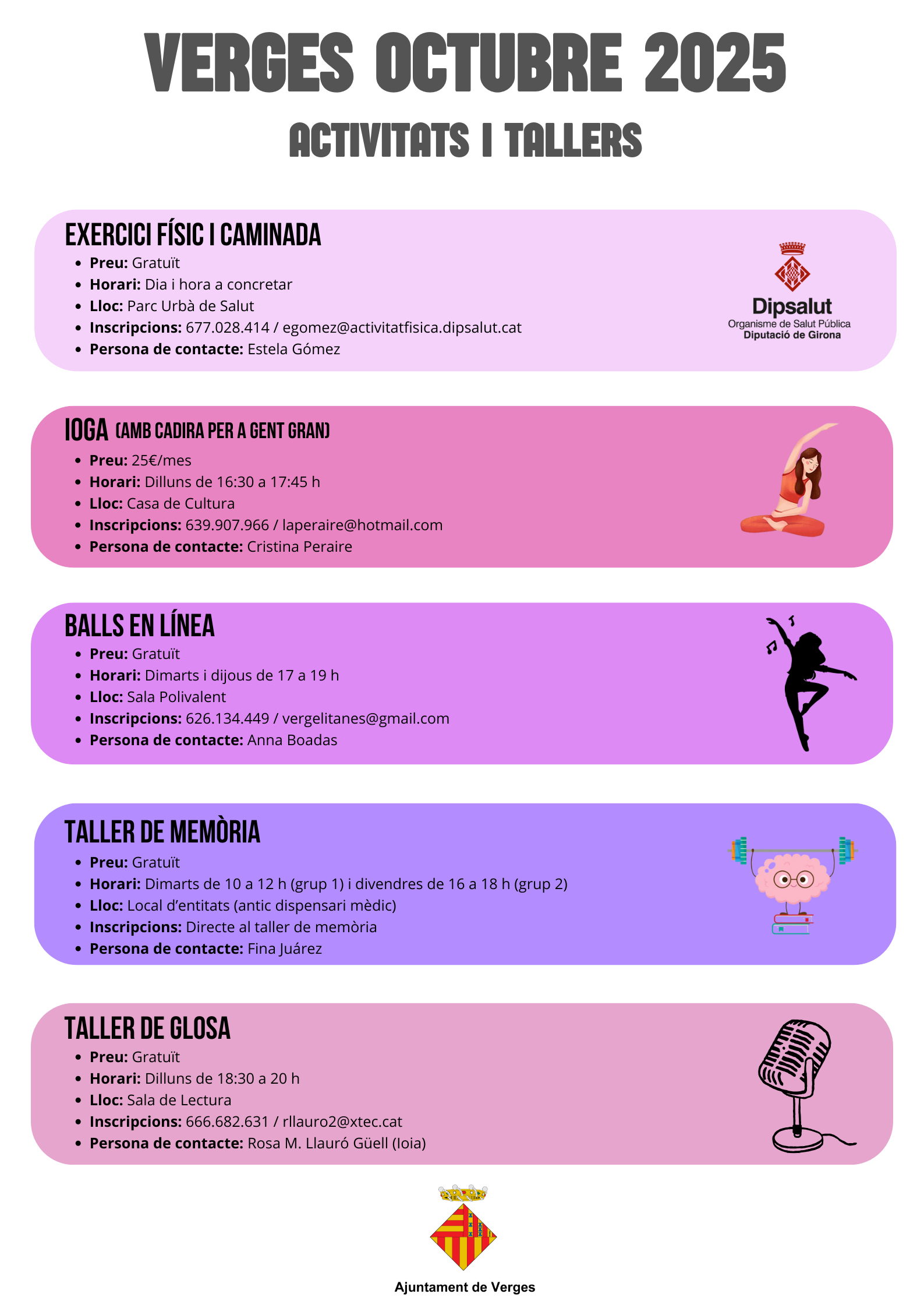 Us avancem l’agenda d’activitats i/o tallers del proper mes d’octubre que es realitzaran al nostre municipi. Com podeu observar, encara no hi apareix l’activitat física del Parc de Salut, quan tinguem la data i l’horari confirmat us ho farem saber. Tanmateix l’Estela Gómez continuarà dirigint l’activitat.