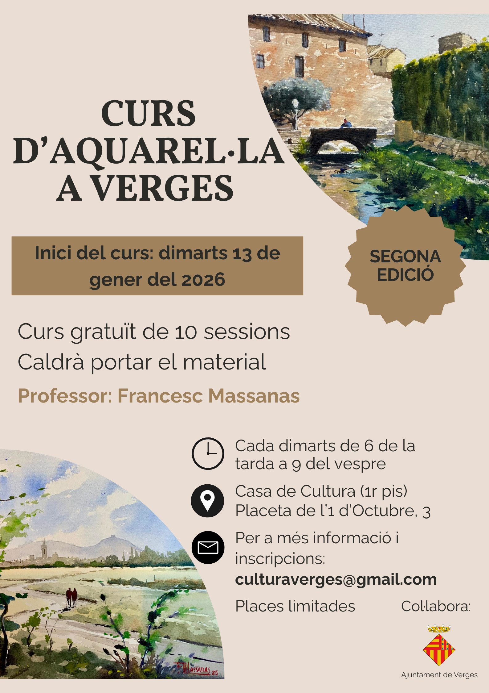Us informem de l’inici de la segona edició del curs gratuït d’aquarel·la, que tindrà lloc a Verges. Després de l’èxit de la primera edició, reprenem aquesta formació artística pensada per a 10 sessions, que es faran un cop per setmana, els dimarts de 6 de la tarda a 9 del vespre, a la Casa de […]