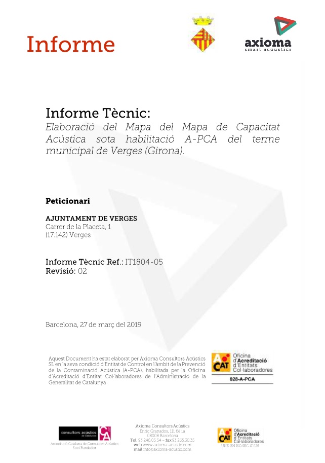 Mapa de Capacitat Acústica Informe Tècnic mapa capacitat acústica sota A-PCA de Verges Plànol 01 terme municipal de Verges Plànol 02 punt de mesures Plànol 03 mapa de capacitat acústica