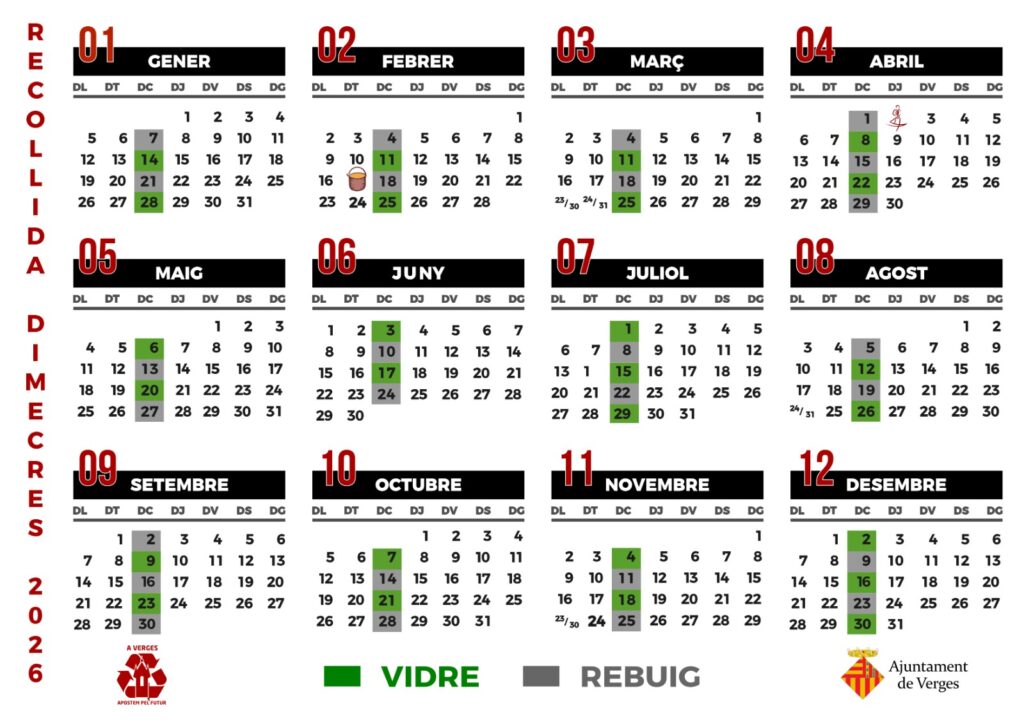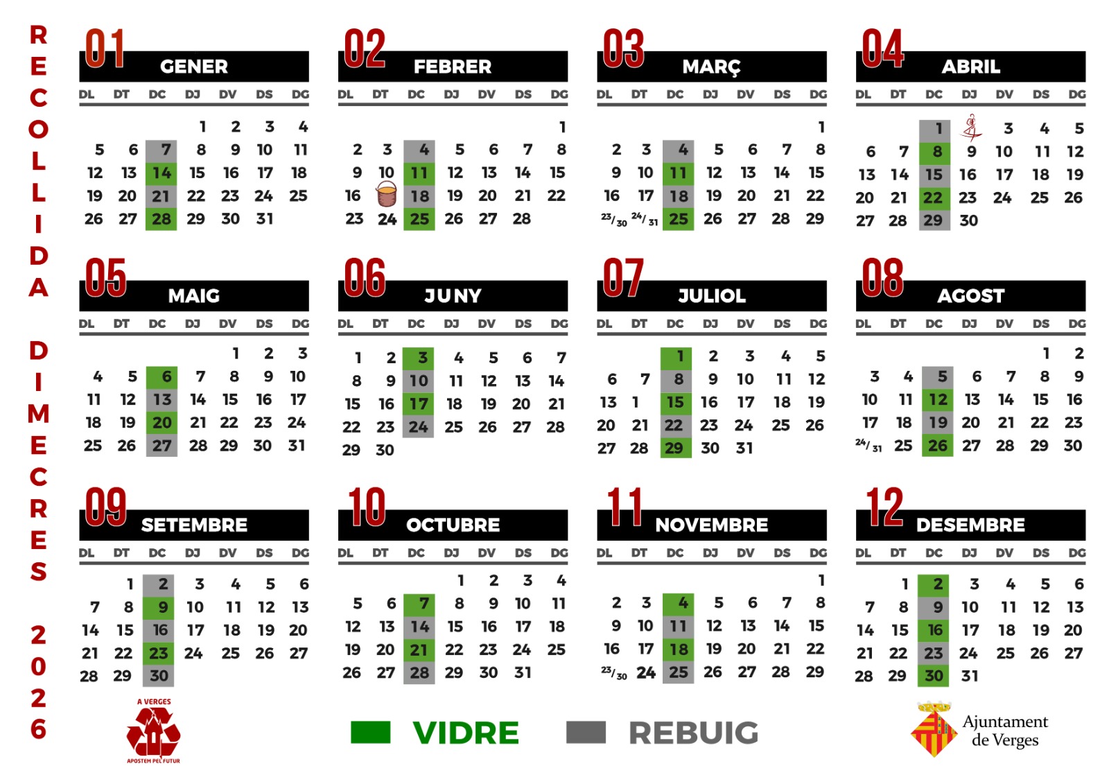 Aprofitem per avançar-vos el calendari 2026 de la recollida de vidre i rebuig (quinzenal)