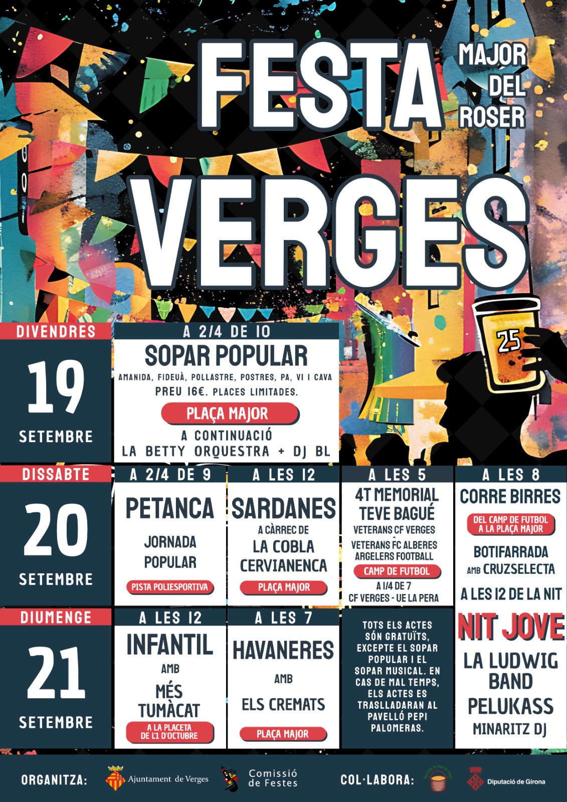 En cas de mal temps, els actes es traslladaran al Pavelló Pepi Palomeras.