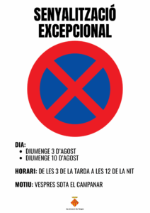 Amb motiu de l’organització i celebració dels actes de “Vespres sota el campanar”, els propers diumenges 3 i 10 d’agost de 3 de la tarda a 12 de la nit, no es podrà parar i/o estacionar cap vehicle a la Placeta de l’1 d’octubre.