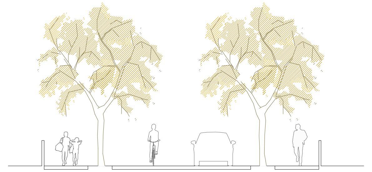 - Franja verda per a la plantació d’arbrat, annexa a la vorera nord. Aquesta disposició garanteix ombra a l’espai de vorera, protecció solar natural a les façanes des edificis i millora l’estètica del paisatge urbà.