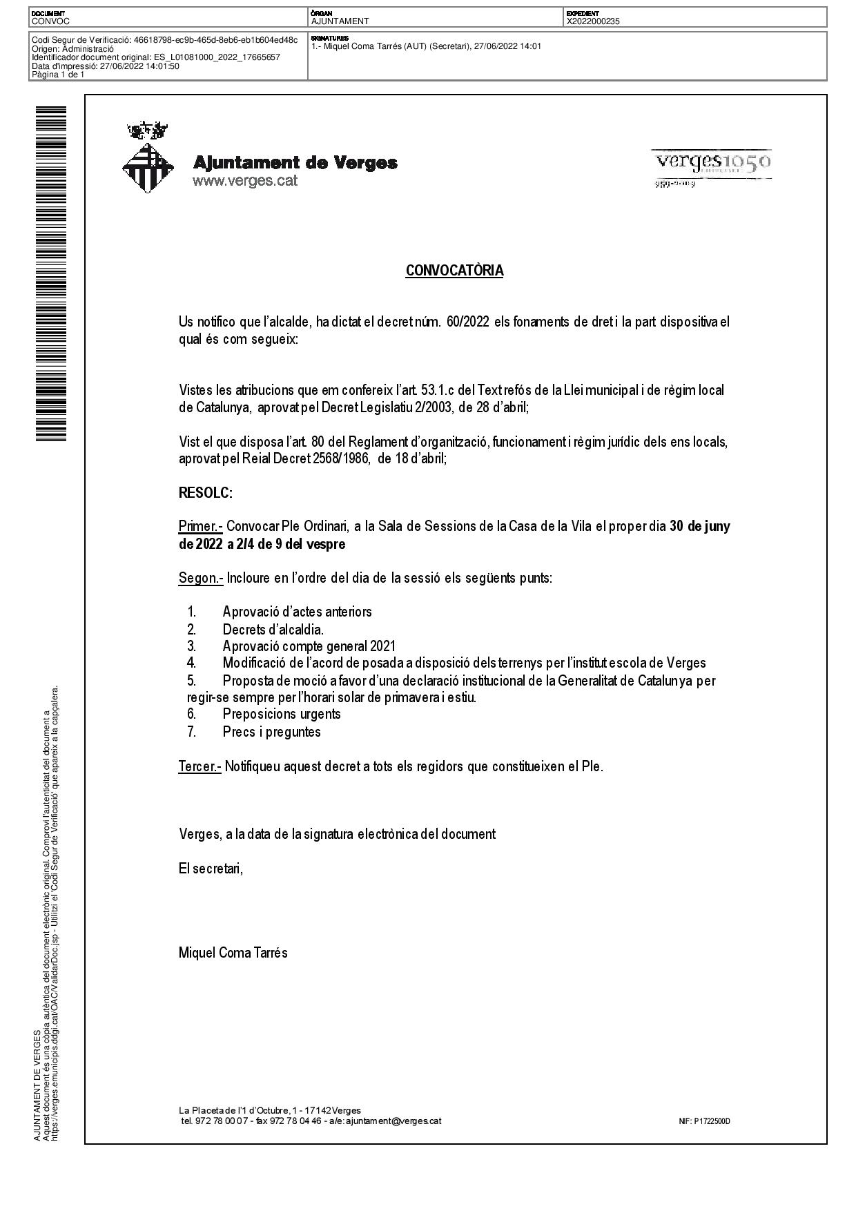 Us convoquem al proper Ple Ordinari que tindrà lloc aquest dilluns, 7 de juliol a les 8 del vespre, a la Sala de Sessions de l’Ajuntamernt de Verges. Convocatòria Ple Ordinari 7 de juliol del 2025