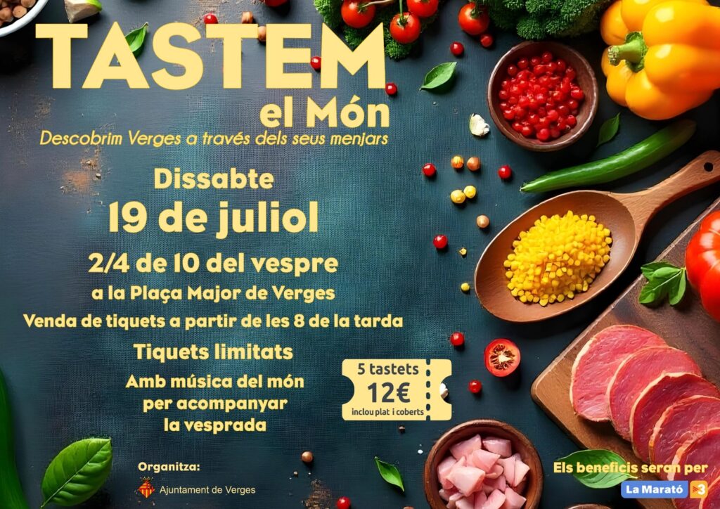 Torna TASTEM EL MÓN, una festa dedicada a les diferents cultures i tradicions culinàries que conviuen a Verges. Dissabte 19 de juliol, celebrarem la 8a edició d’aquest acte, que pretén unir i relacionar cultura, tradició, treball en equip, solidaritat, integració social i voluntarisme.