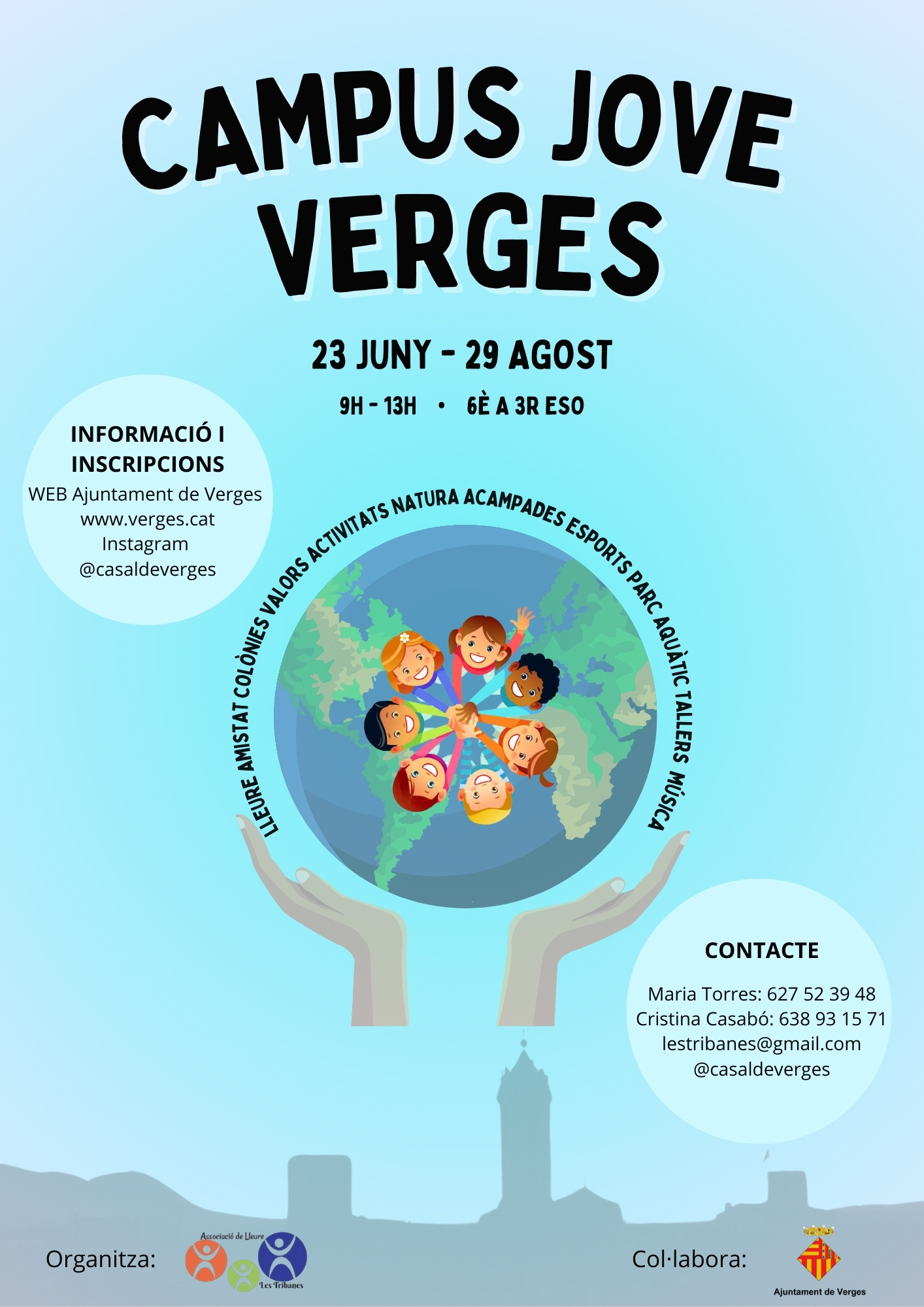 Us animem a apuntar-vos al Casal d’Estiu i Campus Jove de Verges! Aquest estiu, tots aquells nens i nenes de 3 a 16 anys podran gaudir de l’estiu a Verges. L’Associació de Lleure Les Tribanes de Verges organitza del 23 de juny al 29 d’agost el CASAL D’ESTIU (de I3 a 5è de Primària) i el CAMPUS JOVE (6è a 3r d’ESO).