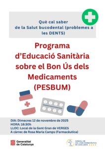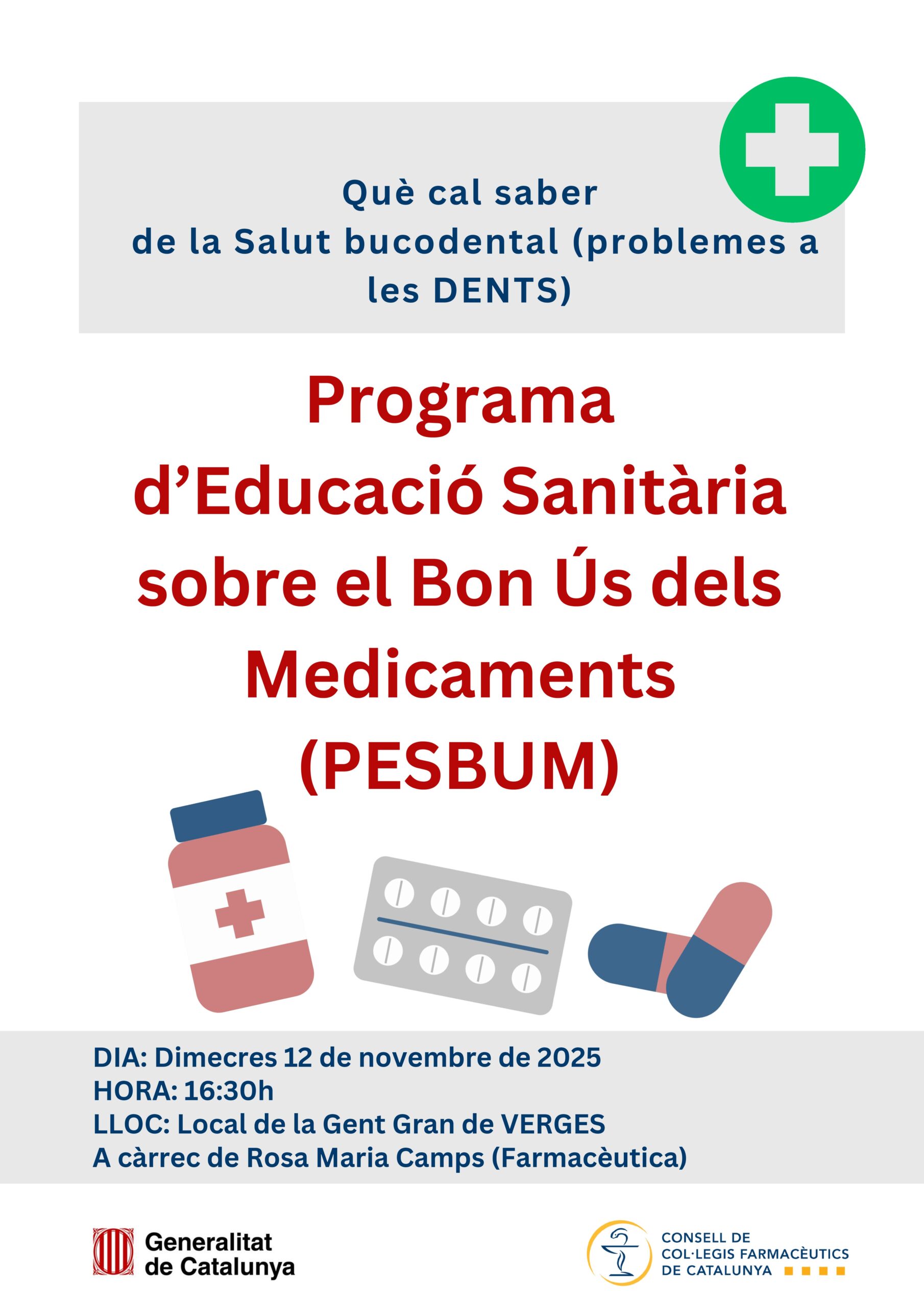 Dins del programa d’educació sanitària sobre el bon ús dels medicaments, organitzat per la Generalitat de Catalunya i el Consell de Col·legis Farmacèutics de Catalunya, es durà a terme una xerrada sobre la salut bucodental.