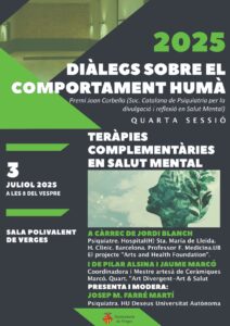 Aquesta quarta sessió anirà dedicada a les diferents teràpies complementàries en salut mental i, anirà a càrrec de Jordi Blanch (Psiquiatre de l’Hospital Santa Maria de Lleida. H. Clínic de Barcelona. Professor F. Medicina de la UB) i de la Pilar Alsina i en Jaume Marcó (Coordinadora i Mestre artesà de Ceràmiques Marcó – Quart)
