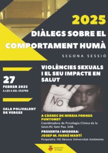 Aquesta segona sessió anirà dedicada a les violències sexuals i a les seves conseqüències i/o impactes en l’àmbit de la salut mental. La sessió anirà a càrrec de la Mireia Forner Puntonet, coordinadora de Psicologia Clínica de la Salut. HU Santa Pau. UAB.